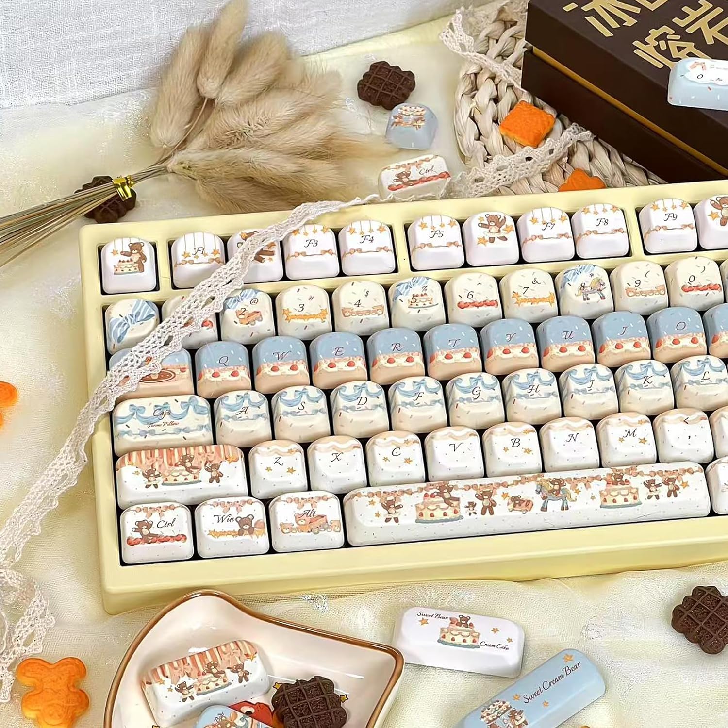 1.🎈【Classic Design】This PBT keycap is designed to be more ergonomic in reducing hand fatigue and discomfort caused by prolonged typing to provide a more comfortable typing experience.2.✨【MOA Profile】Wide key surface makes it less likely for fingers to slip off or press the wrong key, improving typing accuracy. Fingertip and keycap fit better, more uniform force when striking, not easy to fatigue when using for a long time.3.🎈【PBT Keycaps】The keycap Set delivers in quality with ultra-durable PBT keycaps whose legends will never wear away. Compared to ABS material, PBT keys is less common and feel textures and more more durable. It's dry and not easy to get oily.4.✨【Dye Sublimation】As to ensure the impressive color scheme and enjoyable keyboard typing experience, the keycaps applies high quality PBT dye sub technology. The Dye Sub PBT keycaps enhances the overall durability with water and dust resistance.5.🎈【Custom Keycaps】This bear keycaps set has a total of 130 keys,suitable for 60% 65% 70% 75% 80% 96% (61 64 68 84 75 87 96 98 104 108) keyboards like rk61,gk64,gk61,gk68,rk68,rk84,gh60,etc.