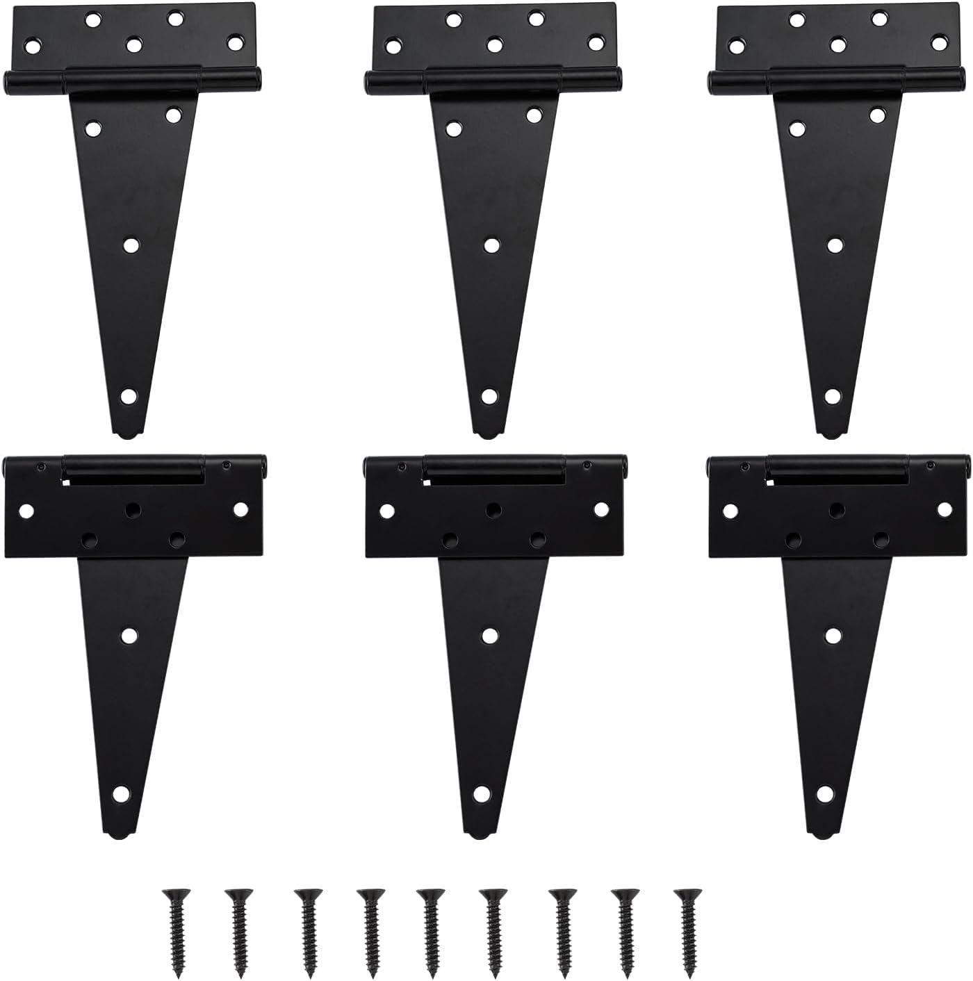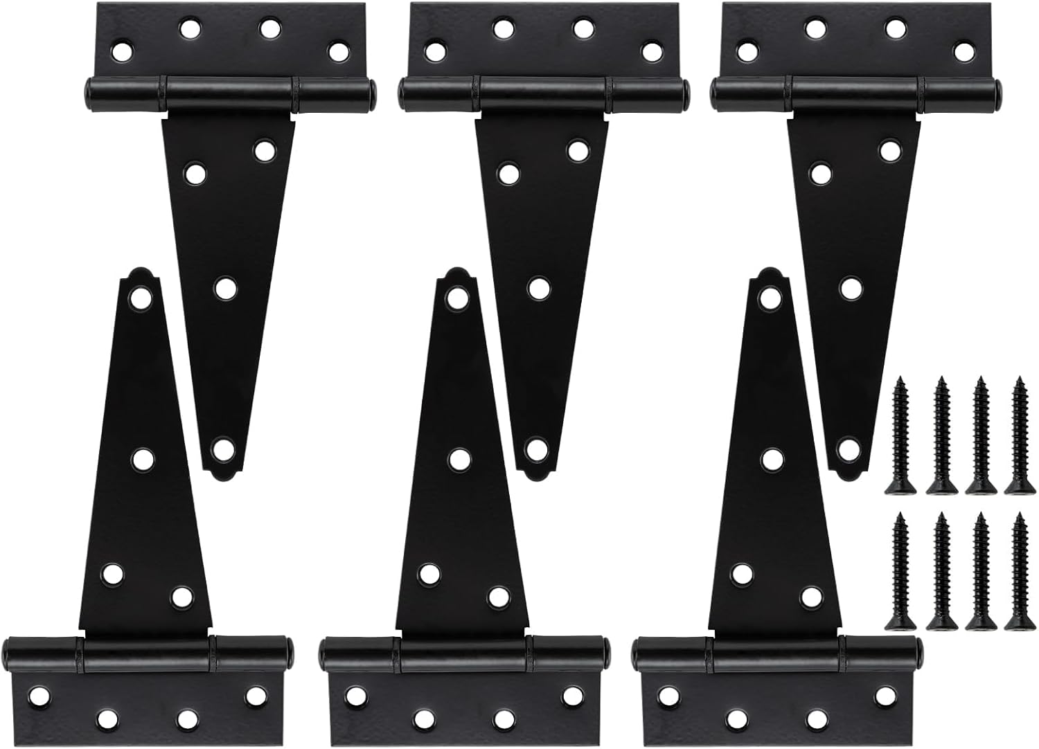 HOME MASTER HARDWARE is found in millions of homes across America. Our heavy-duty decorative T-hinges are made from durable steel with a black finish to ensure their sturdiness, smoothness, and durability. Designed for both right-hand and left-hand applications, these hinges have offset screw holes to provide extra strength and prevent wood splitting. This set includes SIX 10-inch decorative T-hinges and screws to make installation quick and easy. These hinges are ideal for use on barn doors, garage doors, screen doors, fence gates, and more. Choose HOME MASTER HARDWARE for quality products and exceptional service.