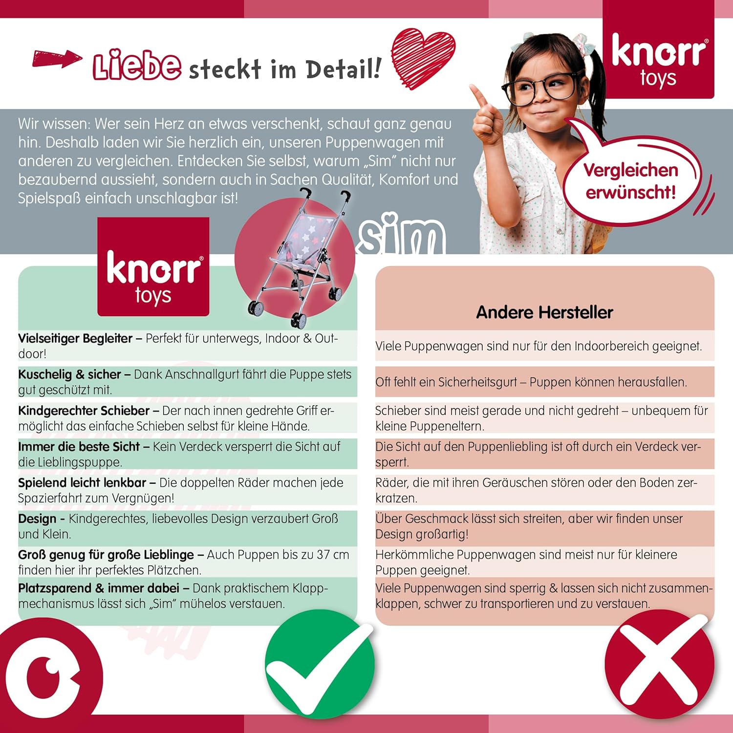 Top modern and practical doll buggy "Sim" by knorrtoys with seat belt and inward turned handle. Easy, space-saving folding, slider height 55 cm. Dimensions: approx. 42 x 27 x 55 cm. Suitable for dolls up to a size of approx. 37 cm.