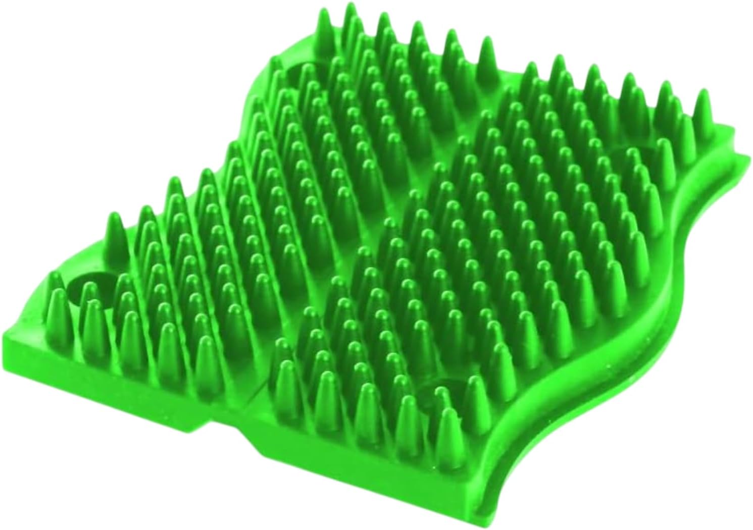 features 212 flexible nubs that provide a consistent surface for animals to rub against, supporting natural grooming behaviors and providing soothing acupressure. Suitable for a wide range of species from horses and pigs to goats, cattle, dogs, cats, and zoo animals the pad offers a familiar and accessible place animals can return to throughout the day. Its textured design encourages routine use and helps create an enriching element within their environment. Hardware and instructions included for easy setup. DURABLE CONSTRUCTION: Made from a sturdy, FDA-compliant elastomer, each pad measures 6" x 5" x 1" and is built for long-lasting use in barns, sheds, stalls, and home settings. The flexible material avoids the stiffness found in some other grooming surfaces and offers a gentle, but firm, feel during rubbing. Stainless steel mounting hardware is included to support a secure installation, making the pad suitable for frequent contact in busy or high-traffic animal areas. Additionally, mounting the pads with zip ties can be used wherever there is a special need. INTERLOCKS & WORKS ON CORNERS: The notched design allows the pad to bend around 90-degree corners and interlock with additional pads to form customized grooming zones. This adaptability makes it easy to place pads on posts, wall edges, stall corners, or flat walls, whether arranged in vertical stacks or wider panels. The modular layout allows caretakers to match each animal’s preferred grooming height and create a setup that fits the space. Zip ties can be used wherever there is a special need.HELPS MINIMIZE WEAR ON SURROUNDING SURFACES: By providing a designated rubbing area, the pad helps reduce the strain placed on structures such as door frames, wooden posts, and walls that may show wear from repeated contact. Surfaces that can splinter or develop rough spots over time benefit from having an alternative option nearby. The flexible nubs offer a smoother texture that encourages animals to use the pad instead of rubbing on fixtures not intended for frequent contact. Made in USASUITABLE FOR VARIED CLIMATES: The elastomer material performs reliably in hot and cold conditions, making the pad suitable for year-round use in barns, stables, kennels, sheds, and homes. Pads can be installed individually or grouped to match each animal’s preferred grooming areas. With included stainless steel hardware, the pad mounts securely to corners or flat surfaces for safe, practical enrichment. For small animals such as sheep and goats, we recommend starting with 1–2 pads. For larger animals like horses, donkeys, and cattle, 4 pads are ideal.