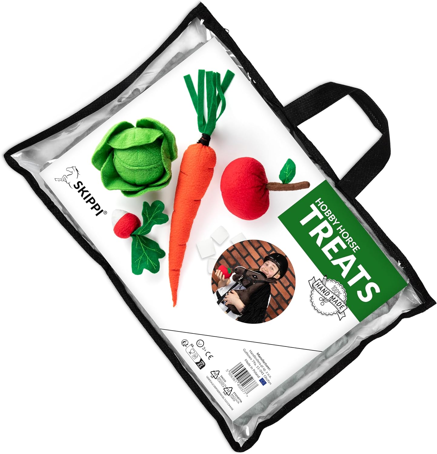 More possibilities and fun Plush vegetables, plush fruit and game sugar cubes for hobby horses are the ideal accessories for games and training. Each treat is soft, pleasant to the touch and imitates its real counterpart well, allowing for safe and engaging play. The set of plush treats promotes the imagination of little horse friends and lets them create their own adventures and play scenarios with the Hobby Horse. Ideal as a reward or motivation for a hobbyhorse training for hobby horsing competitions. This set of play vegetables and fruit makes playing with your favourite hobby horse even more exciting and full of joy.
