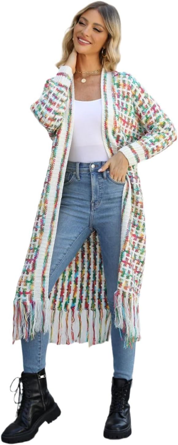 Sizing category: RegularPicture style: StudioPattern type: MulticoloredStyle: Casual, chicFeatures: FringeNeckline: Open frontLength: LongSleeve length: Long sleevesSleeve type: Dropped shouldersMaterial: 100% acrylicStretch: Slightly stretchySheer: NoBody: Not linedCare instructions: Machine wash cold. Tumble dry low.ImportedProduct measurements:S: bust 41 in, sleeve length 18 in, length 41 inM: bust 42 in, sleeve length 18 in, length 42 inL: bust 44 in, sleeve length 19 in, length 42 inXL: bust 45 in, sleeve length 19 in, length 43 in2XL: bust 47 in, sleeve length 20 in, length 44 in3XL: bust 48 in, sleeve length 20 in, length 44 in